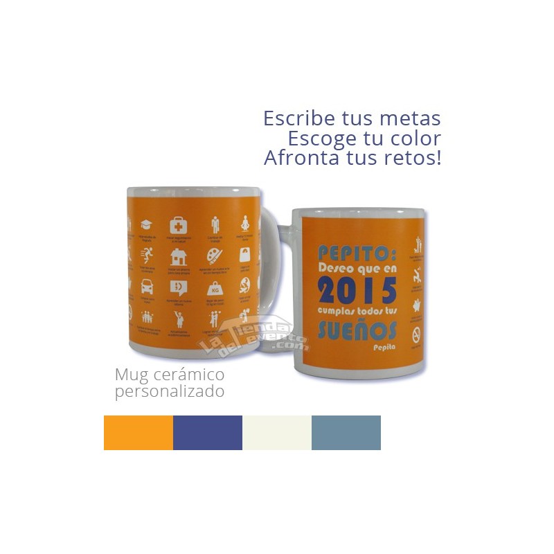 Atrévete! Las metas de la foto son solo un ejemplo, escribe las tuyas! Si el Naranja es tu color, con este mug personalizado tendrás a la vista tus metas de 2015. Disfrútalo en casa o en el trabajo y visualiza lo que te motiva cada día.